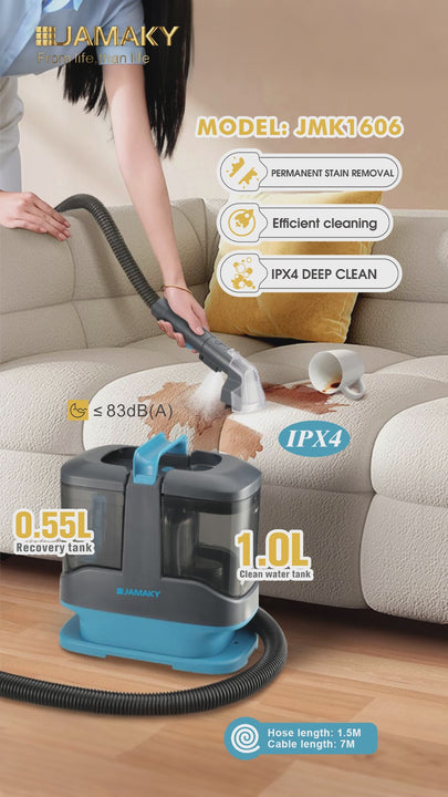 The JMK1606 spot cleaner is designed to easily and efficiently remove tough stains from carpets, sofas, and upholstery.